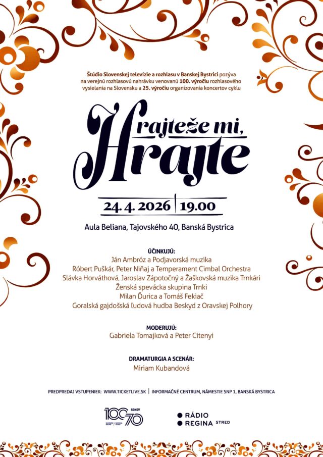 Štúdio Slovenskej televízie a rozhlasu v Banskej Bystrici pozýva na verejnú rozhlasovú nahrávku venovanú storočnici rozhlasového vysielania na Slovensku a štvrťstoročnici koncertov Hrajteže mi, hrajte.