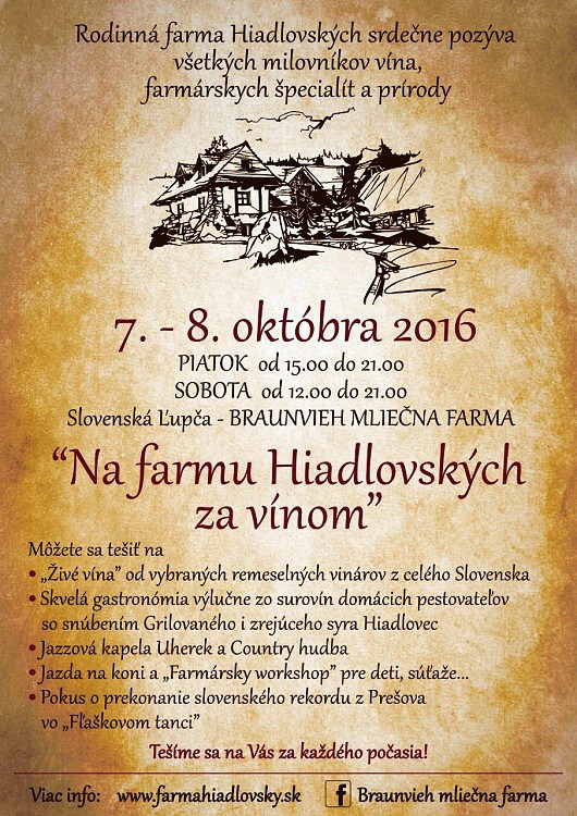 Milovníci vína, farmárskych špecialít a prírody si prídu na svoje o to viac, že podujatie sa po prvý raz koná priamo v priestoroch rodinnej farmy Hiadlovských.