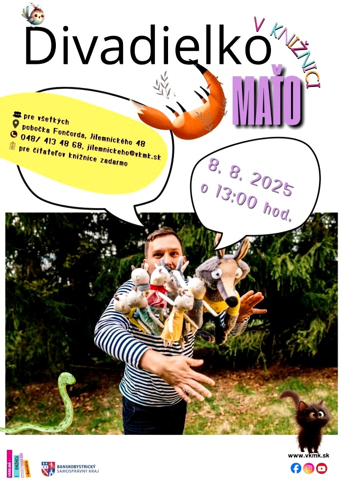 Verejná knižnica Mikuláša Kováča pozýva deti do svojej pobočky na Fončorde (Jilemnického 48) na stretnutie s Maťom. Ten im zahrá rozprávku Kozliatka a vlk. Rozprávka je vhodná pre deti od 6 rokov. Miesto si môžete rezervovať na: 048/ 413 48 68 alebo jilemnickeho@vkmk.sk.