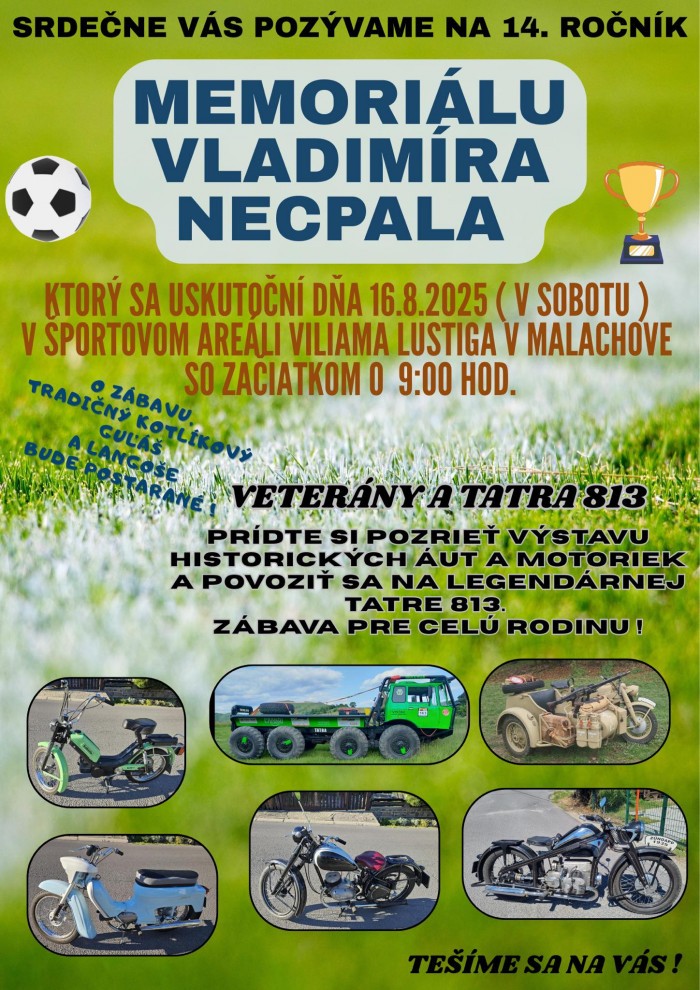 Futbalový turnaj, veterány aj možnosť povoziť sa na Tatre 813, tradičný kotlíkový guláš aj langoše, výstava historických áut a motoriek… Tak toto vás čaká na 14. ročníku Memoriálu Vladimíra Necpala v Malachove. Podujatie sa koná od 9.00 h v areáli Viliama Lustiga.