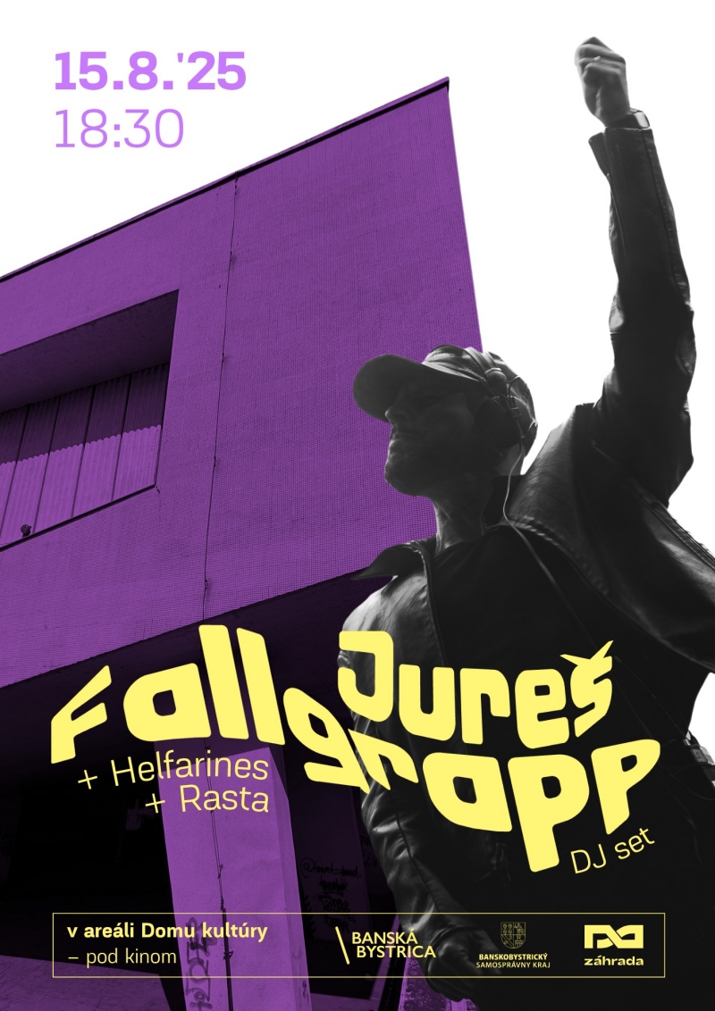 Neváhajte a príďte v piatok k Domu kultúry, kde vám vo vonkajšom átriu zahrajú dídžeji Rasta & Helfarines (18.30 h) a od 20.30 h to bude Jureš Fallgrapp DJ set, elektronický performatívny projekt Jureša Líšku, ústrednej kreatívnej postavy hudobného zoskupenia Fallgrapp. Máte sa na čo tešiť. Bude to večer plný skvelých rytmov, tanca a dobrej energie. Vstup je voľný.